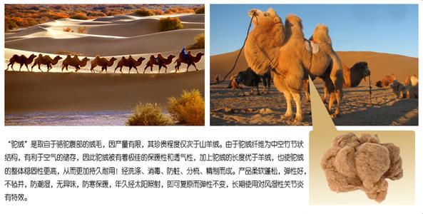答:駝絨是動(dòng)物纖維中耐寒最強(qiáng)的,是制作高檔絨被的重要原料之一。而駝絨制品更是有輕、柔、貼身、溫度適中的特點(diǎn),對身體沒有壓迫感。駝絨被品絨面豐滿,質(zhì)地蓬松,富有彈性,手感厚實(shí),吸濕放熱,可調(diào)節(jié)溫度,恒溫性能好,是一年四季最佳的被褥床品。