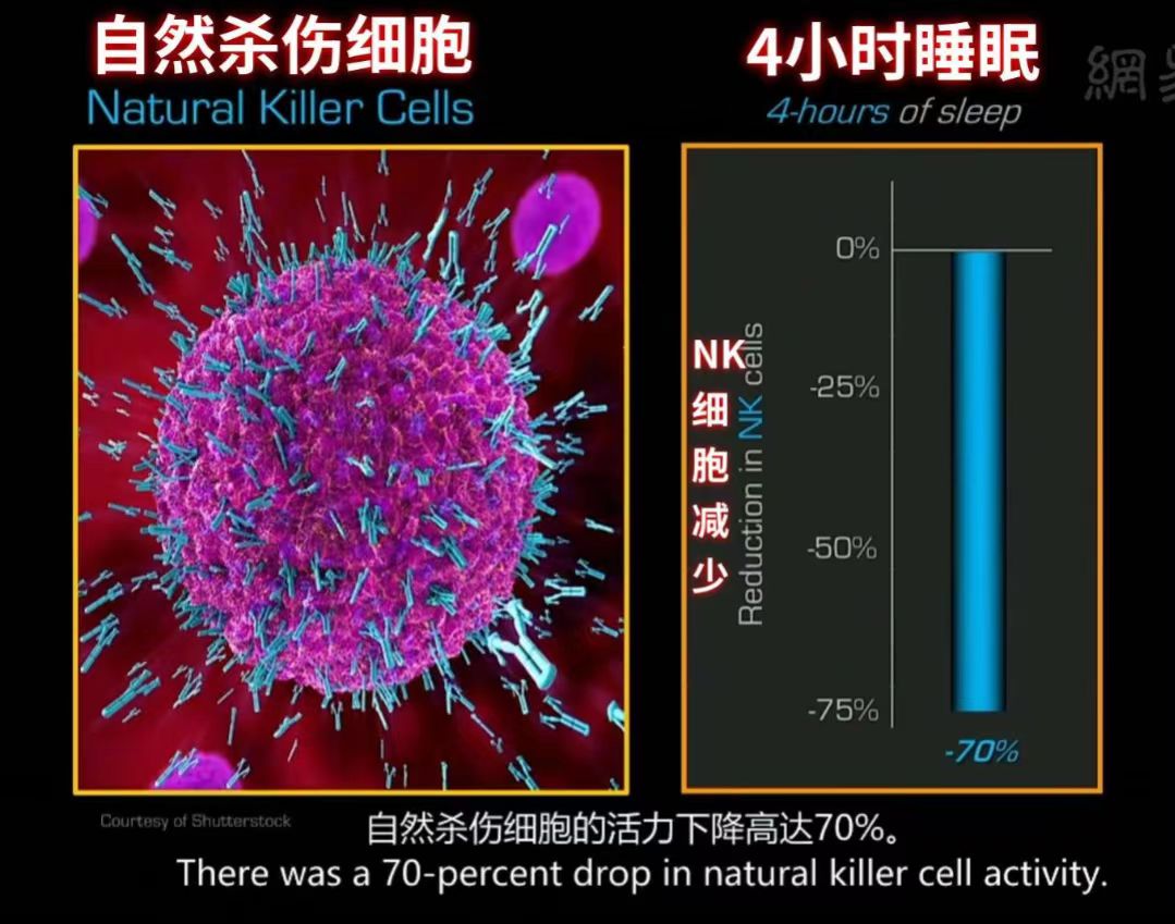 美國加州大學神經科學教授馬特·沃克做過睡眠剝奪實驗:實驗中,將參與者晚上的睡眠時間限制在4小時以內,導致深度睡眠的時間嚴重被縮短,然后觀察他們免疫細胞的變化發現:睡眠控制在4小時以內,其身體中自然殺傷細胞的活力下降了高達70%。這個結果讓人不禁擔憂:僅剩下的30%自然殺傷細胞還能抵御住癌細胞的入侵嗎?可能連普通的細菌、病毒都干不過了吧!
