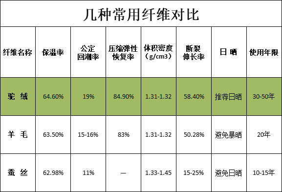 蠶絲屬于長絲纖維,纖維細長而平直,平鋪后,基本不具備豎向彈性和壓縮彈性;駝絨、羊毛和羽絨,單根纖維卷曲或者是立體結構,作為填充物做成團狀或絮狀后,具有豎向壓縮回彈或恢復原狀的能力。人們在生活實踐中知道,羊毛非常容易氈并、板結,蠶絲使用一段時間特別是受潮后容易粘并成綹子,而羽絨回彈性最好,但只能是散狀、團狀,形不成整張平整的絮胎。駝絨的優(yōu)勢,在于不氈并不板結,能長久保持蓬松。